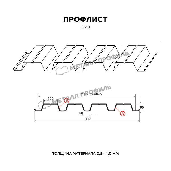Профлист МЕТАЛЛ ПРОФИЛЬ Н-60x845-A (ПЭ-01-5005-0,7) часто используется для обустройства профилированного листа. Представляет собой стальной оцинкованный лист с покрытием. Общая толщина стальной основы с оцинковкой и полимерным слоем — 0.7 мм. После проката на специальном оборудовании сталь принимает волнообразный вид. Жёсткость профилированного листа на порядок выше плоского.