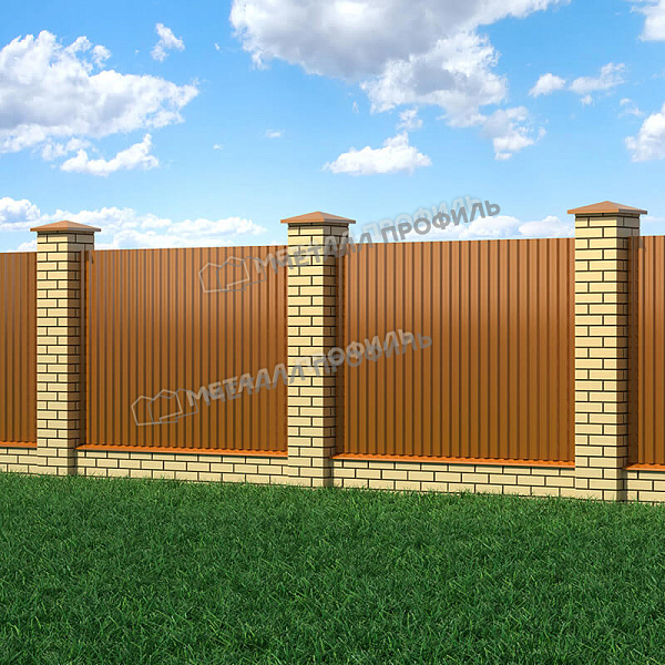 Профлист МЕТАЛЛ ПРОФИЛЬ С-21x1000-A (AGNETA_Д-03-Copper-0,5) — популярный материал для монтажа профилированного листа. Изначально он представляет собой стальной оцинкованный лист с покрытием. Толщина металла с оцинковкой и защитно-декоративным покрытием — 0.5 мм .Проходя процедуру холодного проката, сталь принимает волнообразный вид. Несущая способность такого листа на порядок выше плоского.